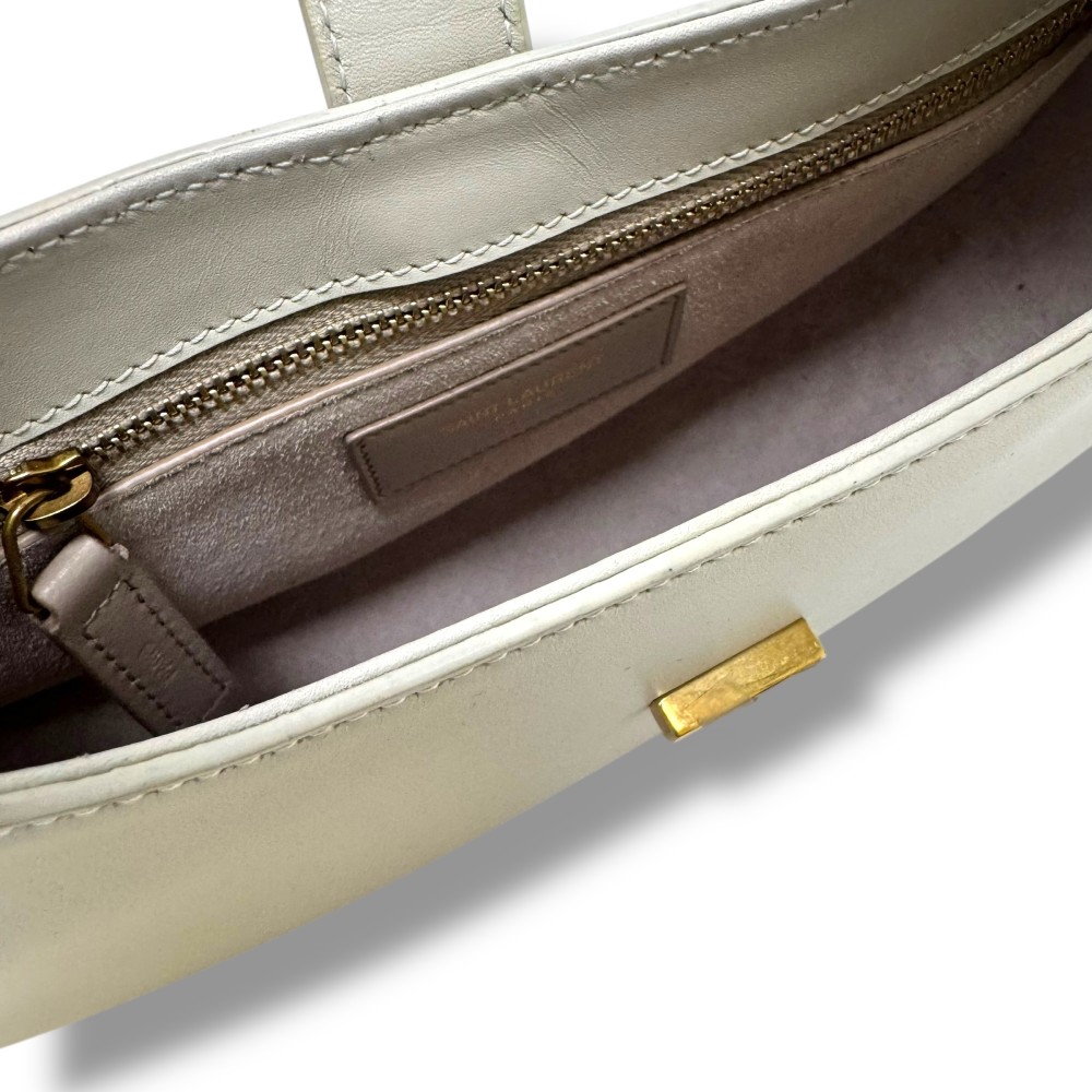 La borsa Le Fermoir di Saint Laurent rappresenta un perfetto equilibrio tra eleganza strutturata e modernità. Realizzata in pregiata pelle di vitello liscia, si distingue per la silhouette raffinata e il design pulito, arricchito da dettagli sofisticati e finiture metalliche.